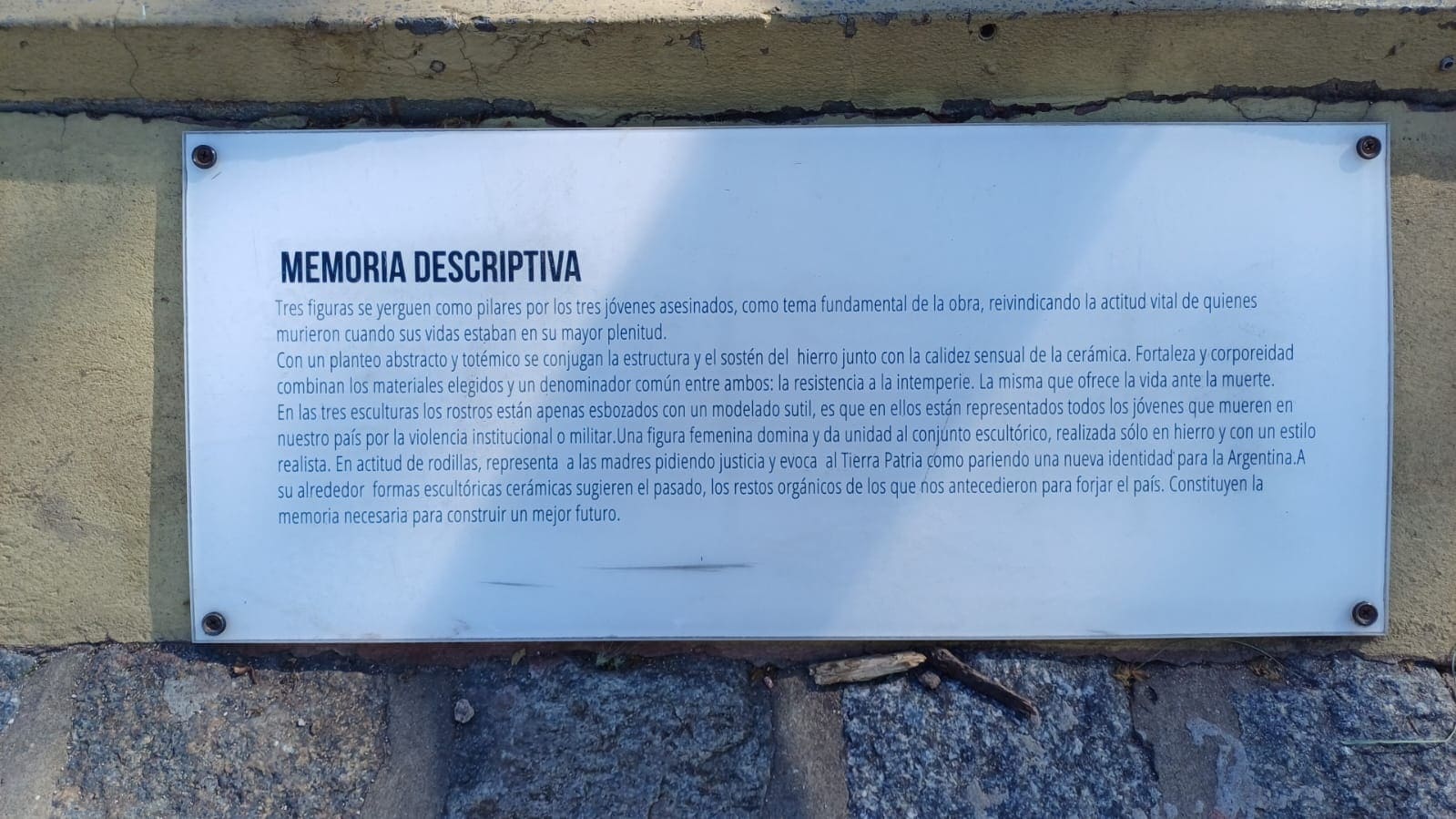 Tres figuras se yerguen en pilares de la presencia de los tres jóvenes asesinados constituyendo el tema fundamental de la obra que busca reivindicar la actitud vital de quienes murieron injustamente en circunstancias en que sus vidas estaban en plenitud, con todas las posibilidades en potencia: el trabajo, la procreación, la salud, el goce, la creatividad, una vida de ciudadanos. En actitud de rodillas representa a las madres pidiendo justicia y evoca a la Tierra-Patria que se nutre a sí misma de la memoria colectiva para parir una identidad. A su alrededor descansan formas escultóricas en cerámica.