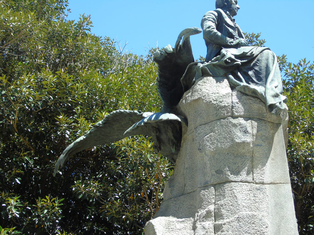 Sobre una base de mampostería que imita la cima de una montaña, se encuentra la figura del prócer en actitud sedente, elaborada en bronce. Su figura se halla en un plano superior con respecto a un cóndor, que al volar por debajo de la estatua demuestra que el pensamiento del prócer se elevaba a mayor altura que el Rey de los Andes.