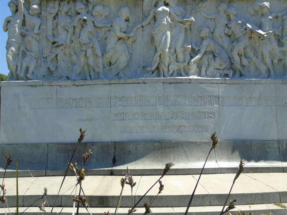 Obra ejecutada en mármol y bronce. Se halla coronado por una enorme estatua de “LA REPUBLICA” realizada en mármol, su base se levanta sobre el centro de una piscina que data del año 1910, rodeada por grupos escultóricos también de mármol que representan “EL TRABAJO”, al pie del monumento en los cuatro vértices de la base cuadrangular se encuentran cuatro figuras de bronce que simbolizan: “LOS ANDES”, “EL PLATA”, “LA PAMPA” y “EL CHACO”. En el frente, hacia el sureste, se encuentra grabada la siguiente leyenda “Y ASEGURAR LOS BENEFICIOS DE LA LIBERTAD PARA NOSOTROS, PARA NUESTRA POSTERIDAD Y PARA TODOS LOS HOMBRES DEL MUNDO QUE QUIERAN HABITAR EN EL SUELO ARGENTINO”, más abajo “A LA NACION ARGENTINA EN SU PRIMER CENTENARIO POR ESPAÑA SUS HIJOS-25 DE MAYO DE 1910”; hacia el noroeste “UNO MISMO EL IDIOMA”; hacia el suroeste “GRANDES SUS DESTINOS”; hacia el noreste “DE UNA MISMA ESTIRPE”.