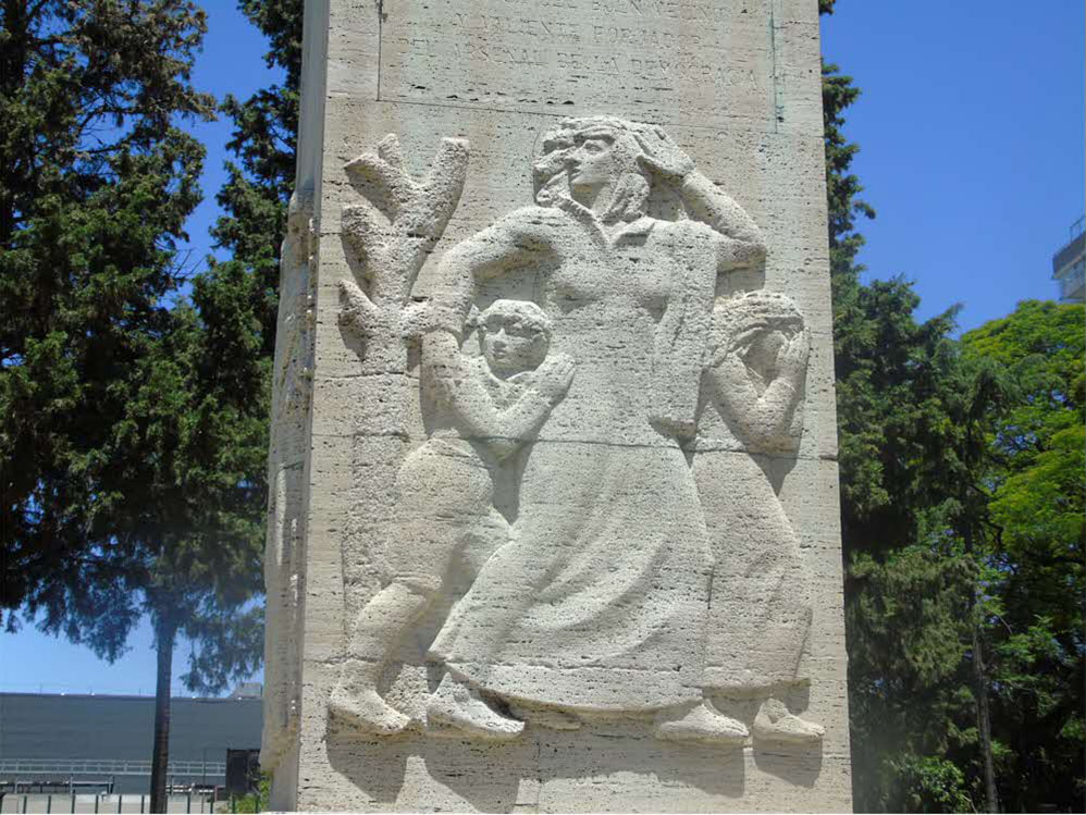Estatuas de bronce, emplazadas sobre una base de mampostería, revestida de mármol travertino nacional, apoyándose sobre los fustes unidos por un pilar. Siendo el principal de 4 metros de altura, y ostentando cuatro relieves del mármol del revestimiento y simbolizan: “LIBERTAD DE LAS NECESIDADES”; “LIBERTAD DEL TEMOR” y “LIBERTAD DE LA PALABRA”. “RETOÑO”.