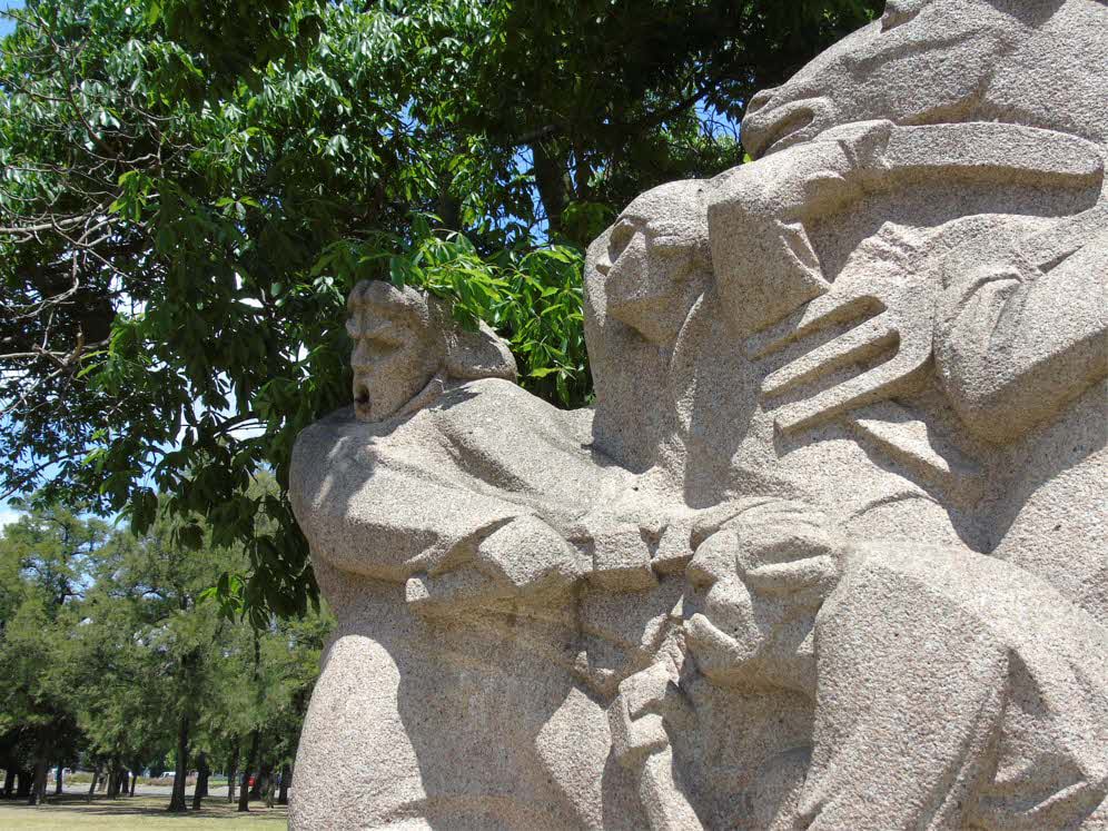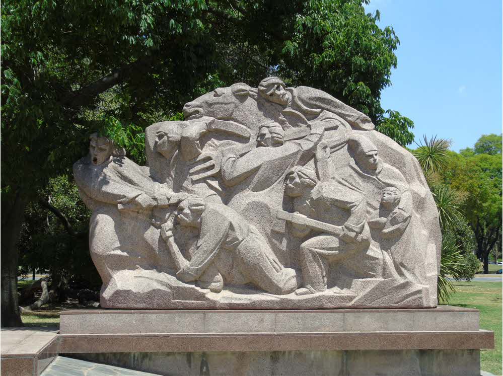 Figura de bronce de 3,45 m. de altura parece avanzar con gestos declamatorios. Sobre el pedestal de granito rojo dragón hay varias inscripciones con fragmentos de la obra del escritor y su lucha incansable por la libertad de su patria. A su derecha se encuentra un doble relieve en un bloque único de granito, obra del escultor Orio Dal Porto. El mismo presenta ocho personajes populares que avanzan tumultuosamente y en conjunto hacia el extremo izquierdo del bloque.