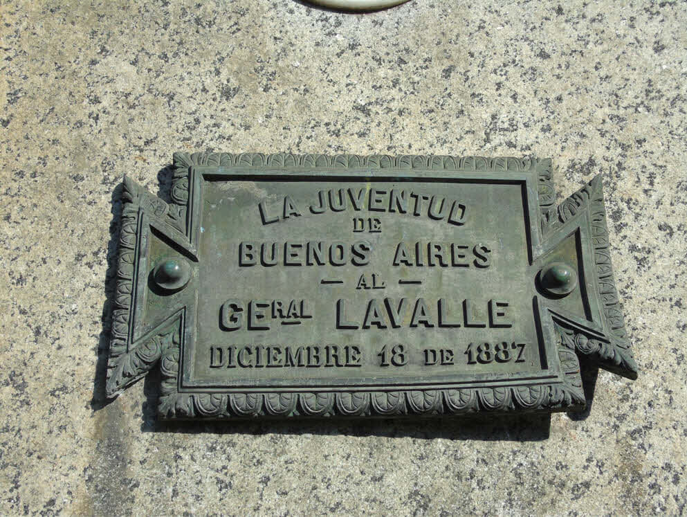 AL GENERAL DON JUAN LAVALLE INTREPIDO COMANDANTE DE LOS GRANADEROS A CABALLO HEROE INVICTO DE LA INDEPENDENCIA AMERICANA EN SU PRIMER CENTENARIO HOMENAJE DEL EJERCITO ARGENTINO ARSENAL DE GUERRA 12 DE OCTUBRE DE 1887 |